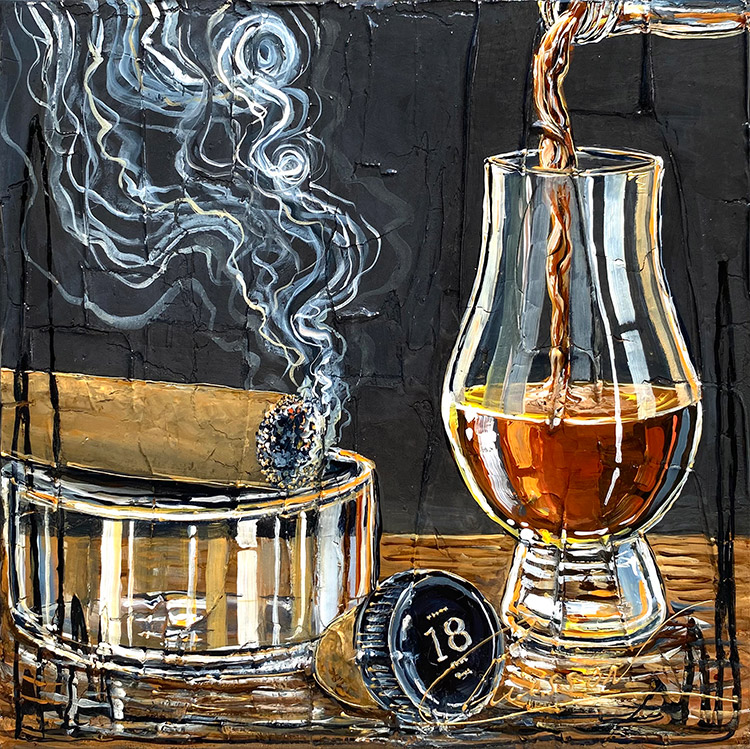 Chaque œuvre est une exploration de la beauté et de la signification cachée dans les objets du quotidien. Par un style unique, à la fois rustique et contemporain, elle transpose au lavis de café ses sujets sur la toile, façonnée d’une texture craquelée lui donnant un aspect presque sculptural.